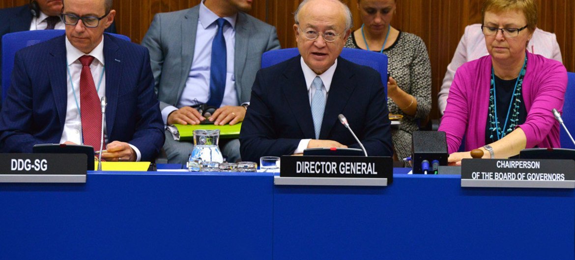 国际原子能机构总干事天野之弥在该机构理事会有关伊核问题的一次会议上讲话。原子能机构图片/Dean Calma